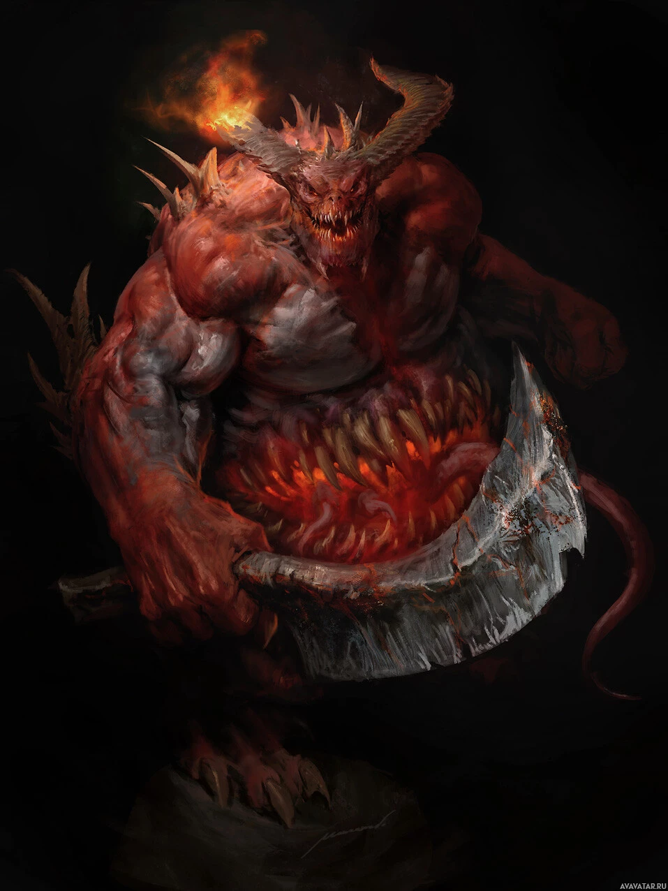 sharp teeth. It's holding a weapon that resembles a cleaver with flames coming out of it. The artwork showcases a dark and intense atmosphere, likely designed to evoke themes of power or menace commonly associated with demons in