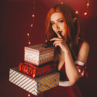 festive outfit, possibly inspired by traditional holiday attire. The individual is holding multiple gift boxes, suggesting that they are either receiving gifts or perhaps part of