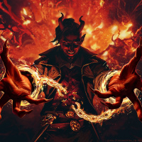 sort of spell or power. There are flames and energy emanating from the hands, suggesting a fiery or magical ability. The background is fiery red, with what looks like chains or fire connecting to the figure's arms, reinforcing the theme of power or enslavement.