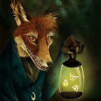 fox character that appears to be dressed in a coat and holding a lantern with its paws. The fox has a thoughtful or curious expression on its face, and there are butterflies flying around it. It looks like a whimsical or fantasy-themed illustration rather than a realistic depiction of an animal.