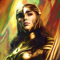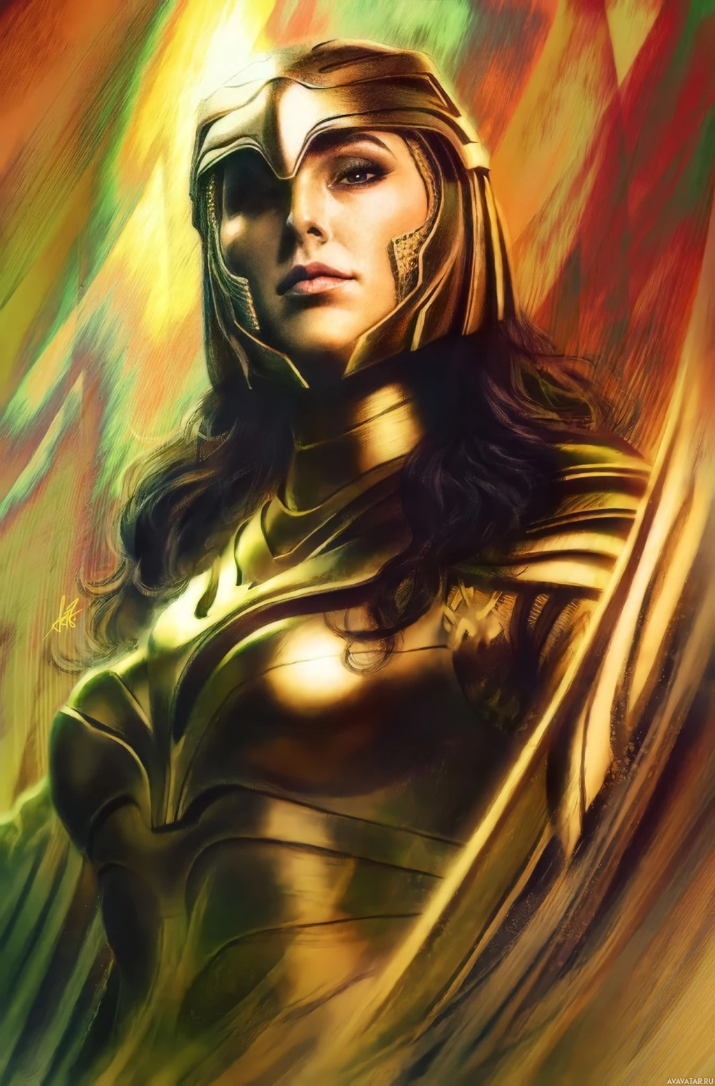 intricate designs that suggest she may be of mythological or fantasy origins. The armor includes shoulder pieces and chest plates, adorned with patterns that could be interpreted as