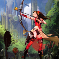 a young girl with brown hair, wearing a red outfit with some armor elements. She's holding a bow and arrow, ready to shoot or has just shot an arrow. The setting appears to be a fantasy-themed forest or clearing with
