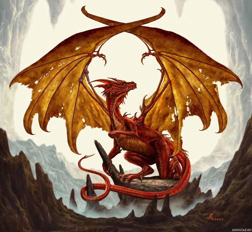 На картинке изображен фантастический дракон. Это художественное изображение, а не фотография реального существа. Дракон изображен в ярком стиле, с оранжевой и желтой чешуей, сидящий на скале посреди горного пейзажа. Фон создает впечатление пещеры или подземелья.