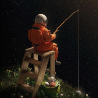 the night sky, which appears to be filled with stars, suggesting that they may be on an extraterrestrial body like the moon or another celestial body. The setting seems serene and contemplative, capturing