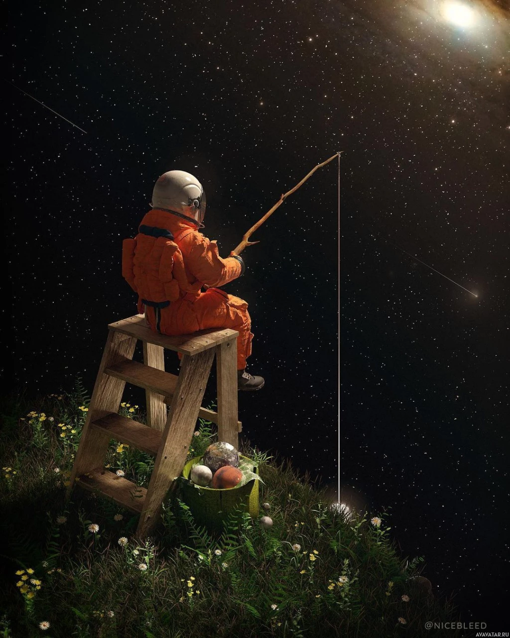 The image shows an astronaut sitting on a ladder with