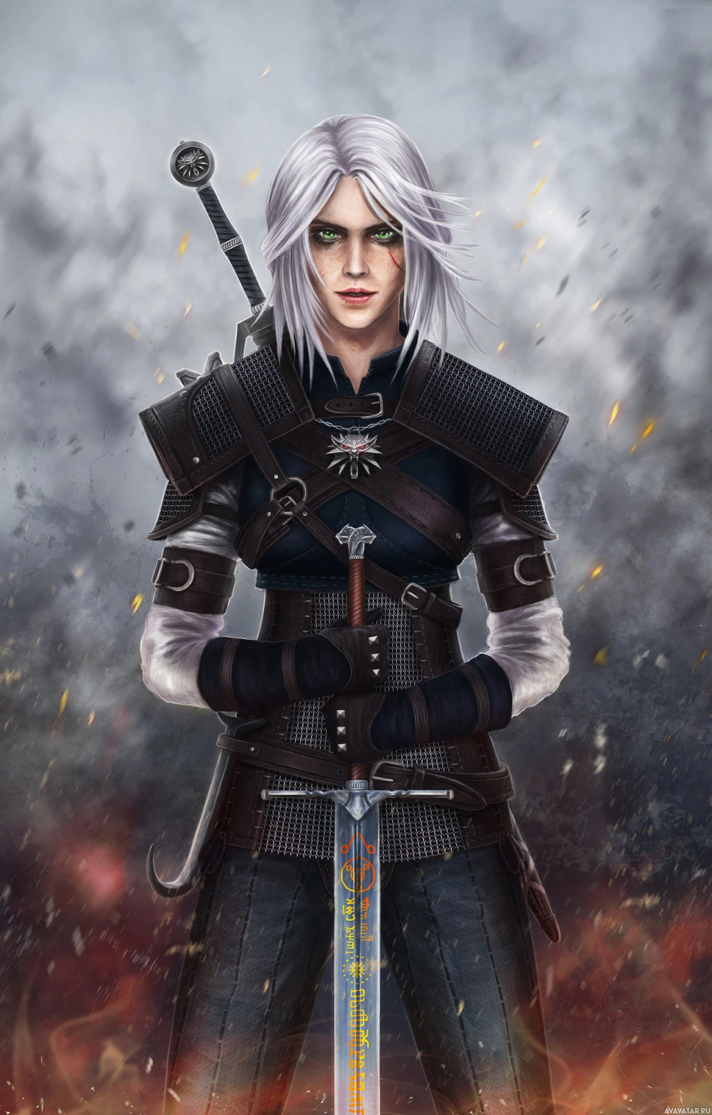 the video game "The Witcher 3: Wild Hunt," specifically Ciri (also known as Cirilla Fiona Elen Riannon). She is portrayed with her distinctive