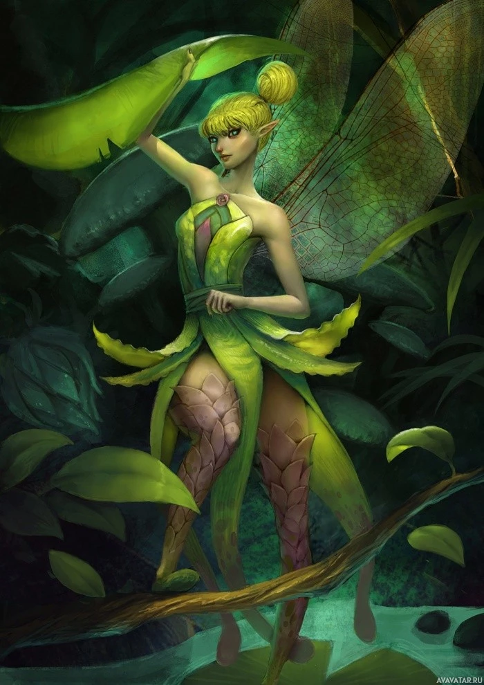 fantasy fiction, specifically resembling a fairy. The character has wings and is dressed in a leaf-like costume, suggesting she may have powers related to nature or plants. She appears to be standing on green foliage, which could indicate that the setting is a forest or