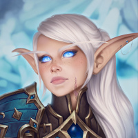 This image features a fantasy character that appears to be an elf. The character has white hair, pointed ears, and is wearing armor with blue highlights. The design suggests it could be related to the Warcraft game series or similar fantasy media.