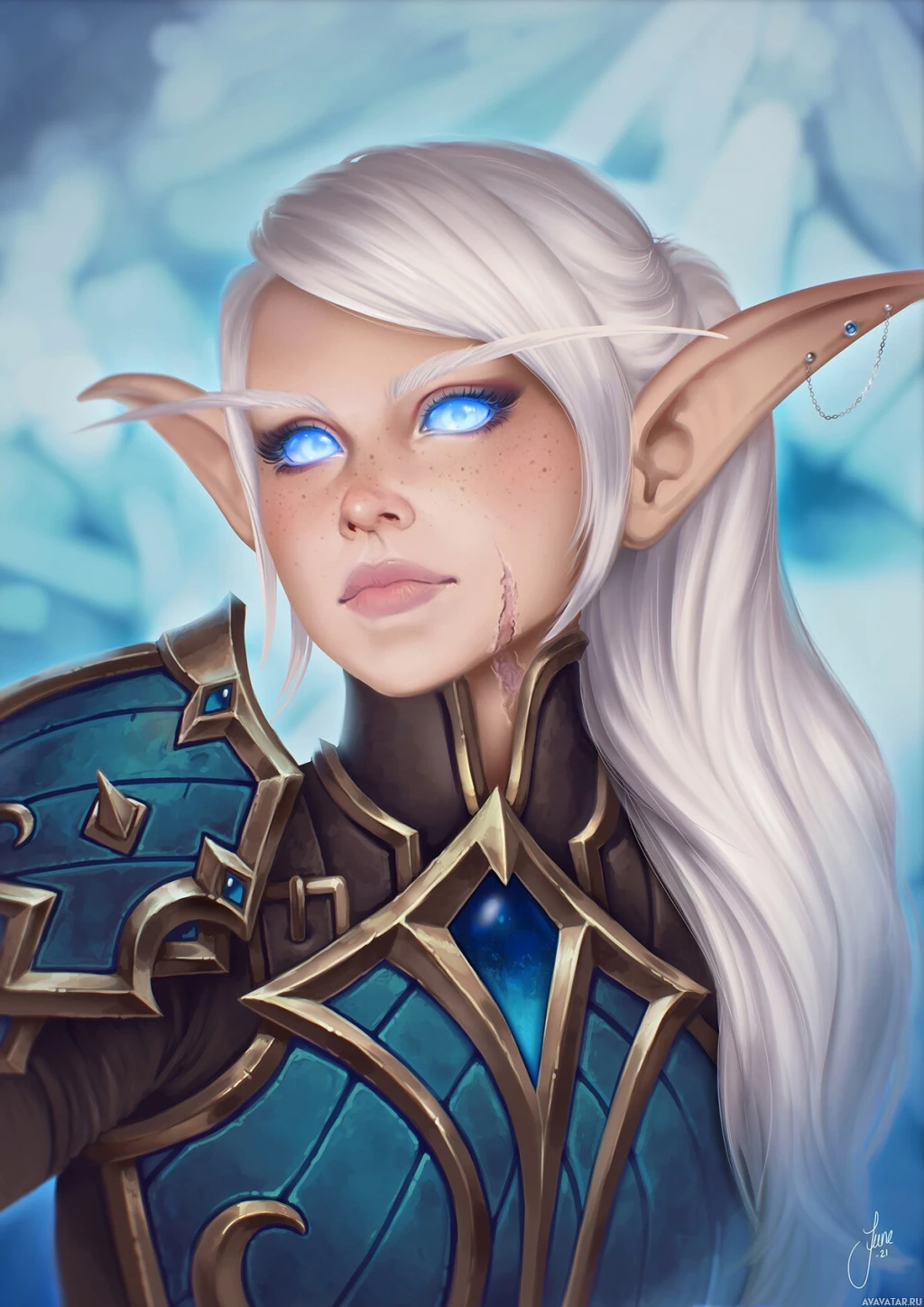 На этом изображении изображен фэнтезийный персонаж, похожий на эльфа. У персонажа белые волосы, заостренные уши и броня с синими вставками. Дизайн позволяет предположить, что он может быть связан с серией игр Warcraft или похожими фэнтезийными медиа.