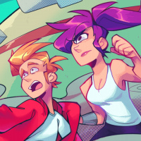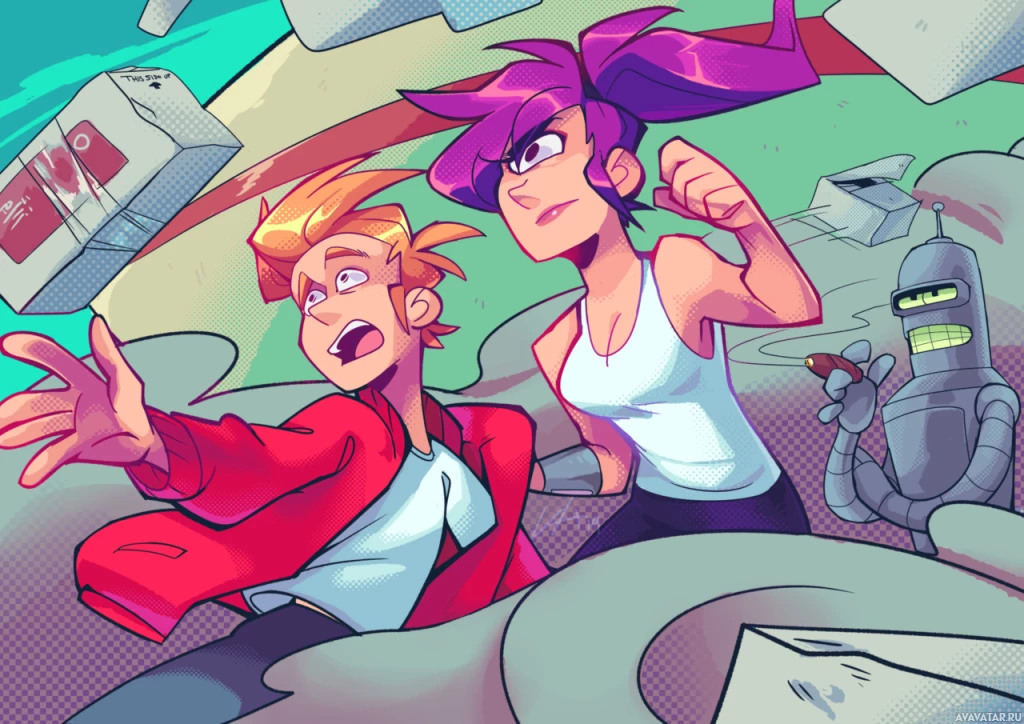 a futuristic setting, reminiscent of the style seen in "Futurama." One character has