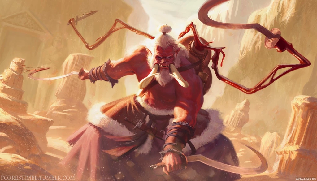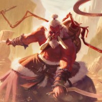 large ears and pointed teeth, while also displaying human-like characteristics like facial hair and armor. This character is wielding what looks like two swords crossed in front of him, suggesting he might be a warrior or a figure of importance within this