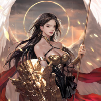 an angelic halo, indicating a divine or supernatural status. The character is set against a dramatic background with clouds and what appears to be lightning or