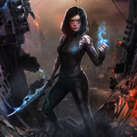 a cyborg warrior or a protagonist of some sort. The background features an industrial or dystopian setting, which is consistent with the narrative of her story.