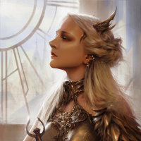 a fantasy setting. The character's expression is serious, and her gaze is directed off to the side, giving