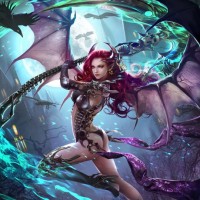 red hair and is wearing what appears to be armor or a costume with demonic features such as wings and horns, suggesting that they may be a succubus or a creature inspired by the mythological concept of a succubus. The character is also holding what looks like