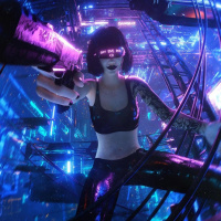 advanced technology. The environment around the character seems to be set in a futuristic or cyberpunk-themed setting.
