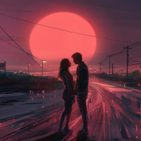 The image depicts a silhouette of a girl and a man standing close to each other on what appears to be a rainy night. The background features a neon sign that reads "WETONES" and a large red moon in the sky. The overall ambiance suggests a romantic or intimate moment between the two figures, with a focus on their connection.