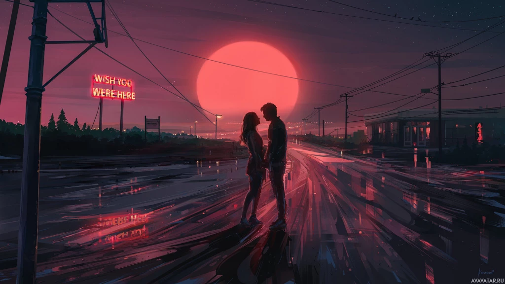 На картинке изображены силуэты девушки и мужчины, стоящих близко друг к другу, судя по всему, дождливой ночью. На заднем плане видна неоновая вывеска с надписью "МОКРЫЕ" и большая красная луна в небе. Общая атмосфера предполагает романтический или интимный момент между двумя фигурами, с акцентом на их связь.