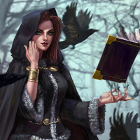 an open book, which could indicate that she is casting a spell or reading from a magical tome. The background features an eerie forest setting with fog or mist, adding to