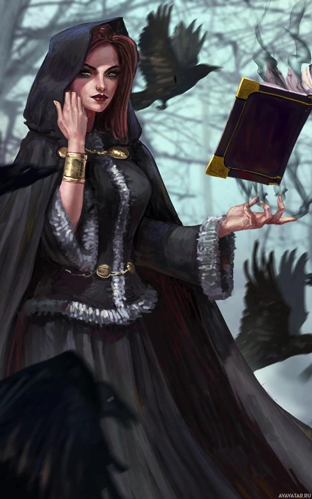 red hair and is wearing a hooded cloak, suggesting she might be a witch or sorceress. In her hand, she holds