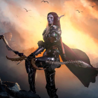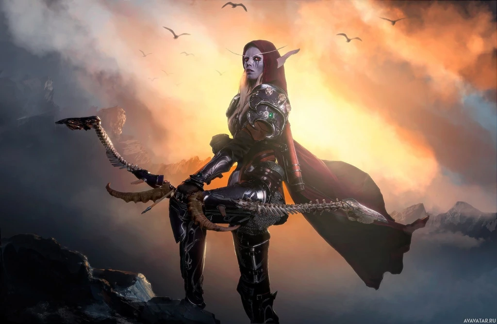 the Warcraft universe, known as Sylvanas Windrunner. She is depicted with long