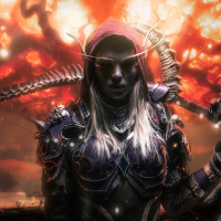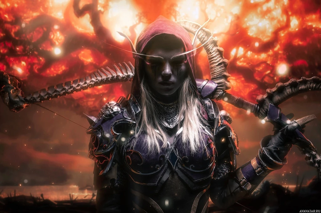 Sylvanas Windrunner, a prominent figure in the game's lore. She is seen wearing armor with a hood and has a glowing,