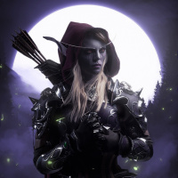 World of Warcraft," complete with a cloak and armor, and she stands with a bow on her shoulder. The background suggests a night scene with