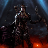 the fantasy universe of the game. She is portrayed with her iconic appearance, which includes pointed ears that resemble those of the night elves and a sleek, humanoid shape with an armor set that often features dark tones and