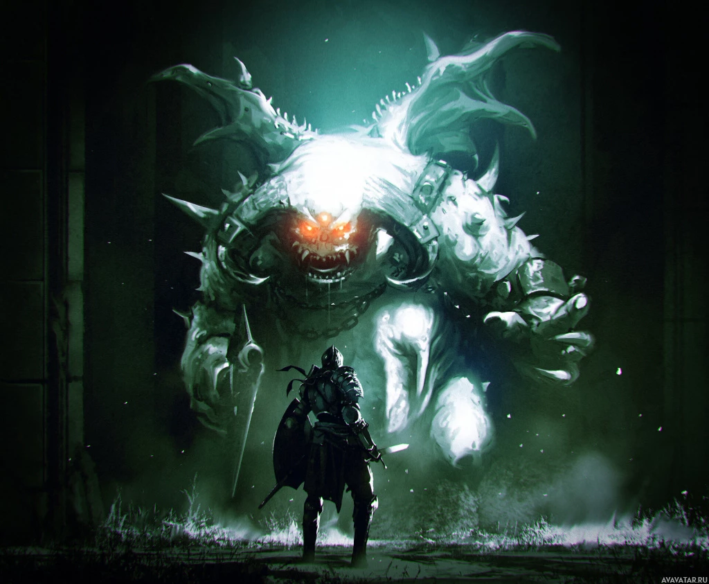 a fantasy scene with a warrior standing in the foreground and an ominous monster looming in the background. The warrior is holding a bow, suggesting they are prepared to face the creature. The setting appears to be outdoors during nighttime or under low