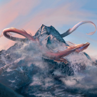 The image depicts a fantasy scene with a dragon. It shows the dragon soaring through the air against a backdrop of mountains and a misty, dawn-like sky. The artwork is detailed and vibrant, with the dragon's scales and movement captured in a dynamic pose. The overall atmosphere suggests a sense of adventure or exploration in a mythical setting.