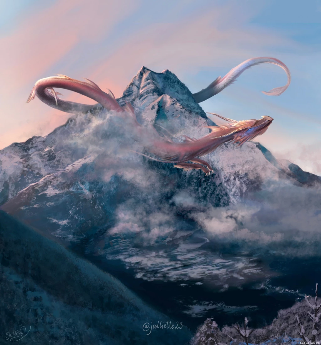 На картинке изображена фантастическая сцена с драконом. На ней изображен дракон, парящий в воздухе на фоне гор и туманного рассветного неба. Рисунок выполнен в деталях и ярко, чешуя дракона и его движения запечатлены в динамичной позе. Общая атмосфера наводит на мысль о приключениях или исследованиях в мифической обстановке.