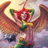 an illustrated character known as Hawkgirl, who is a superheroine from the DC Comics universe. She has wings and is wearing a costume that includes a skirt with star-shaped patterns, gauntlets on her arms, and a helmet with