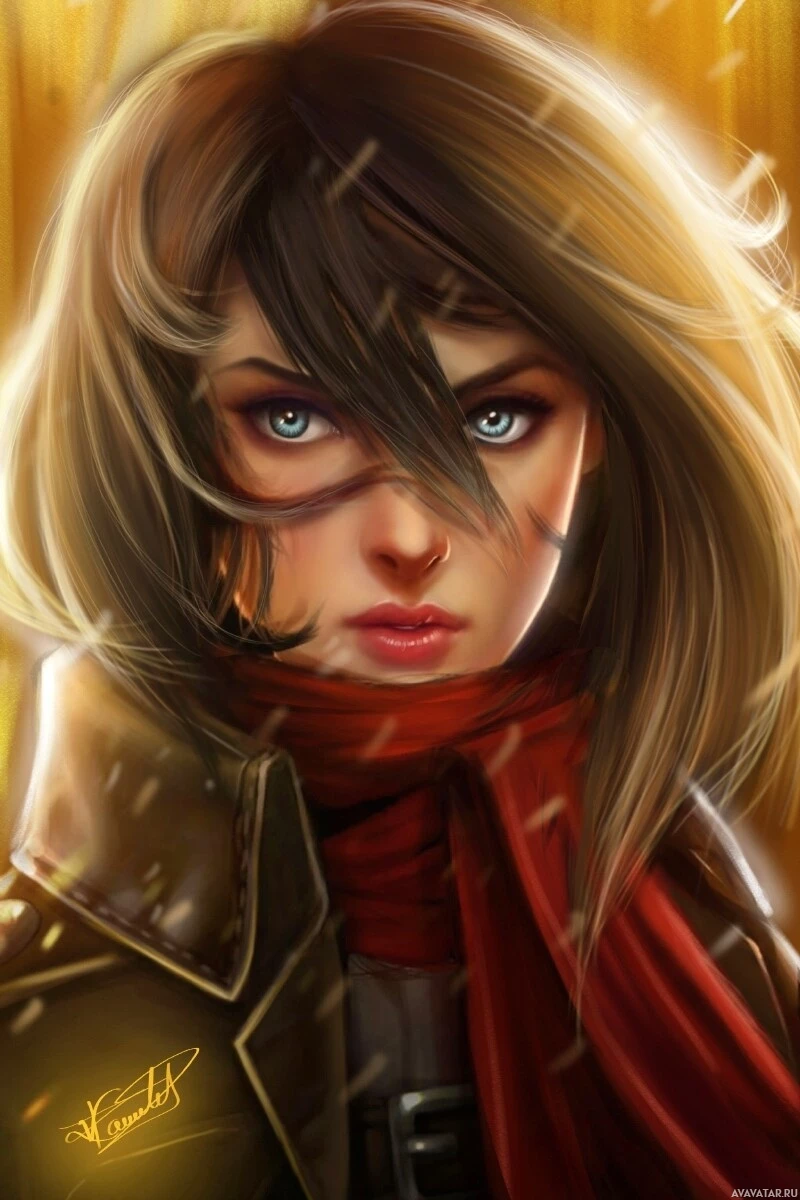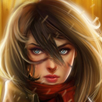 a red scarf or bandana around her neck, and she has a small symbol or emblem near her ear, which could suggest some sort of affiliation or role within a storyline or game. The background is minimalistic with a hint of sunlight or fire, giving it