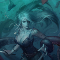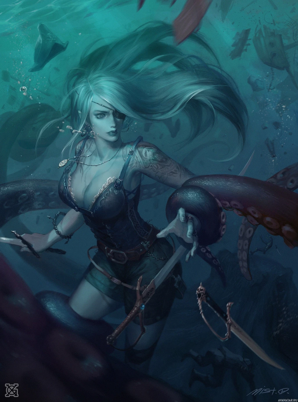 pirate clothing, complete with a corset and other pirate accessories. The background suggests an underwater environment filled with