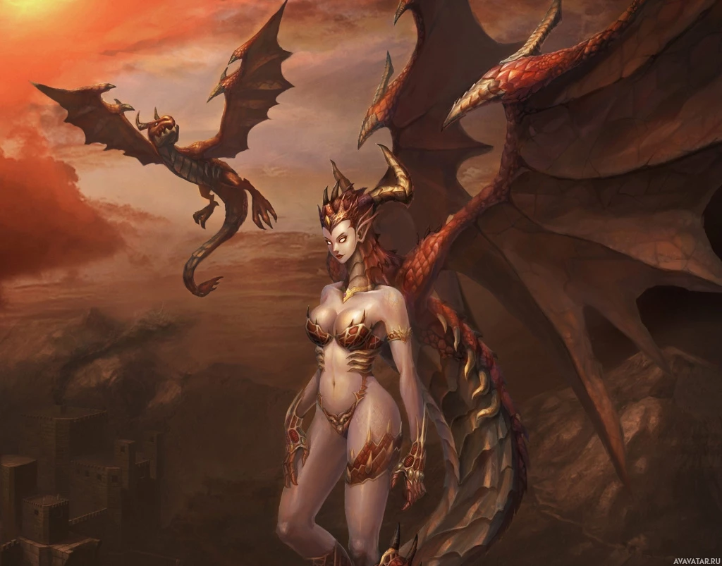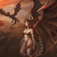a fantasy scene featuring a character that appears to be both human and dragon. The central figure is a female with the upper body of a woman and the lower