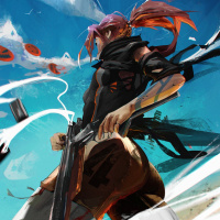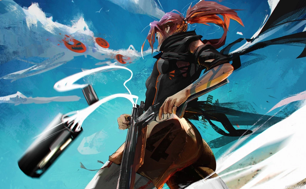 red hair and is holding what appears to be a weapon in her right hand. The background features dramatic