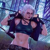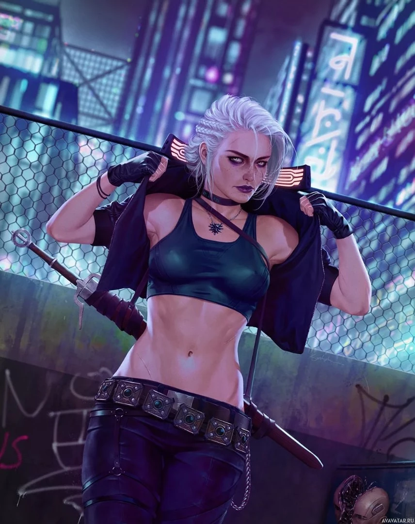 an illustrated character who appears to be Ciri from "The Witcher 3: Wild Hunt." She is depicted in a stylized, cyberpunk-themed design, which suggests that this artwork may have been created for "Cyberpunk 2077," another game developed by CD