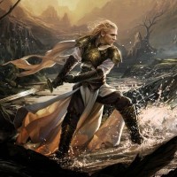 fantasy character depicted in an elf-like form, standing on rocky terrain with her arms ready for combat. She is wearing armor and has a sword at the side. Her hair is blonde and flowing, giving her a dynamic appearance. The background suggests a setting that could be from Middle-earth, characterized by rugged landscapes and