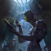an intense expression. In the foreground, there are two other goblins; one is seated and the other stands beside it. The setting looks like a dimly lit, possibly underground environment, which adds to the eerie