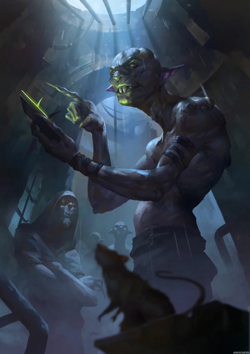 the central figures appears to be an old or ancient goblin, holding what seems to be a scroll or manuscript. This character is looking down at the text with