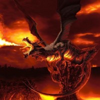an erupting volcano with lava flowing, suggesting a scene of intense heat and destruction. This type of imagery is often associated with
