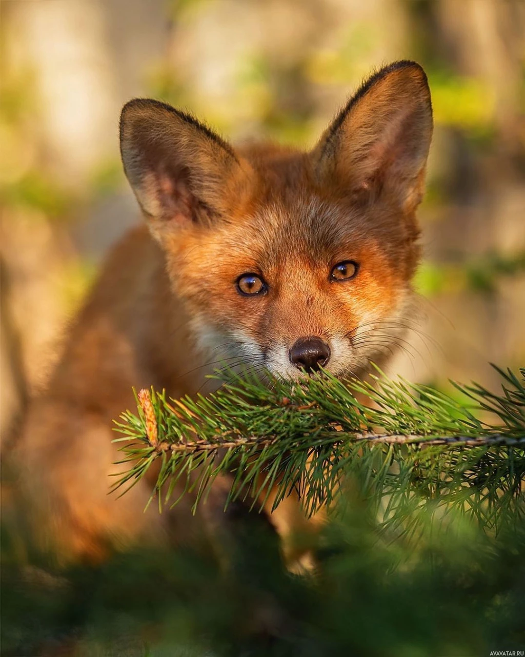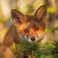 The picture features a fox with a curious and somewhat surprised expression. It appears to be peeking or sniffing at something, possibly