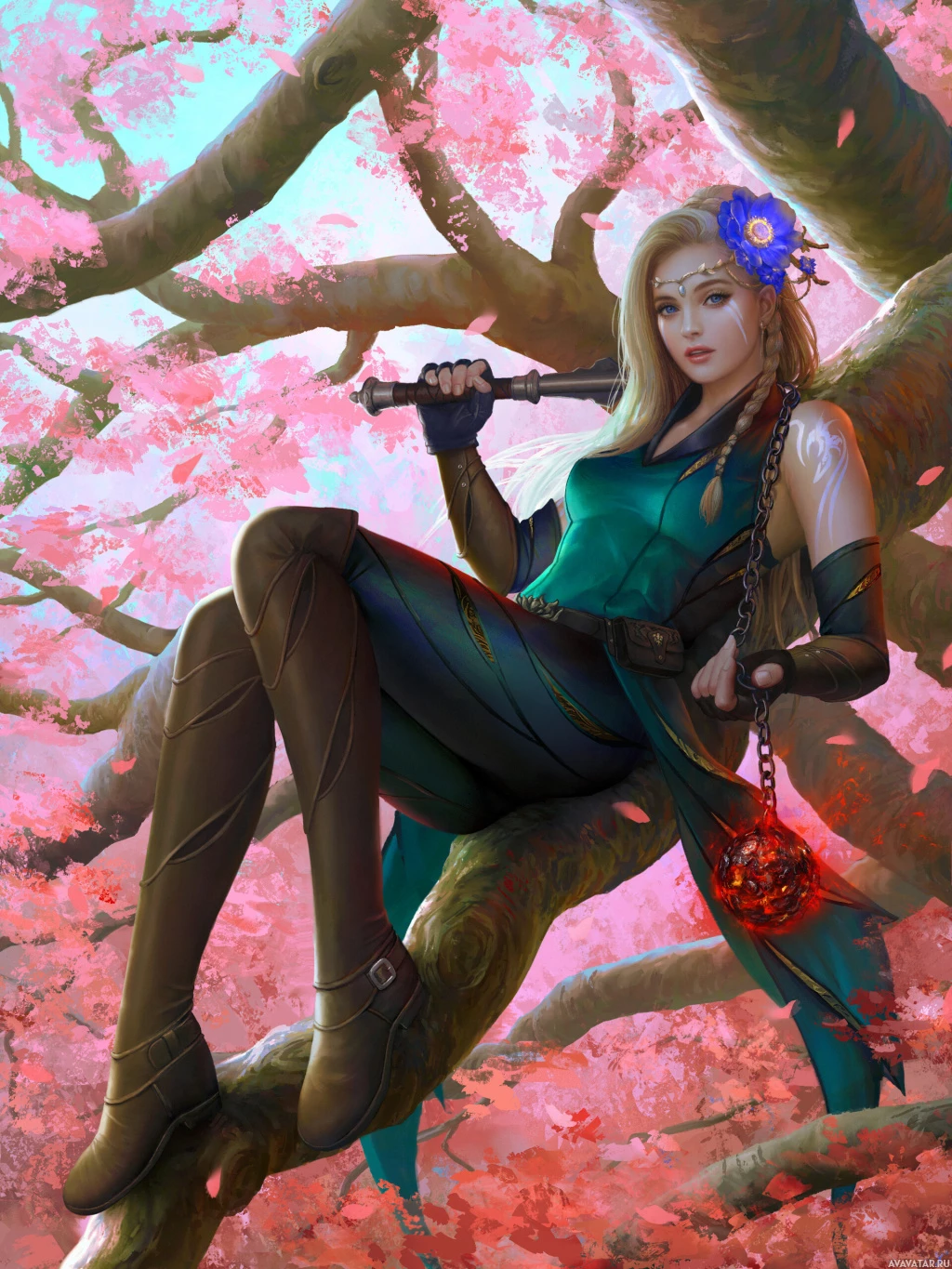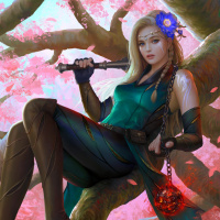pink blossoms adding a touch of color to the scene. The overall atmosphere exudes an air of fantasy and adventure, likely appealing to fans of role-playing games,