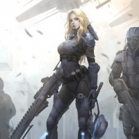 various weapons such as a handheld gun and what appears to be a large rifle slung over her shoulder. The background indicates an environment that could be part of a battlefield, with debris or ruins around. This image may be associated with themes commonly found in science fiction media, such as