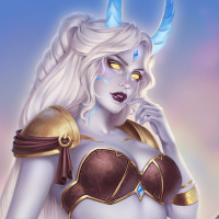 blue markings on their face, hands, and chest, which could represent a tattoo or magical branding. The character is adorned with