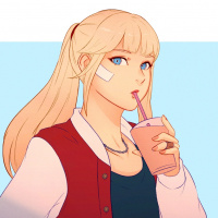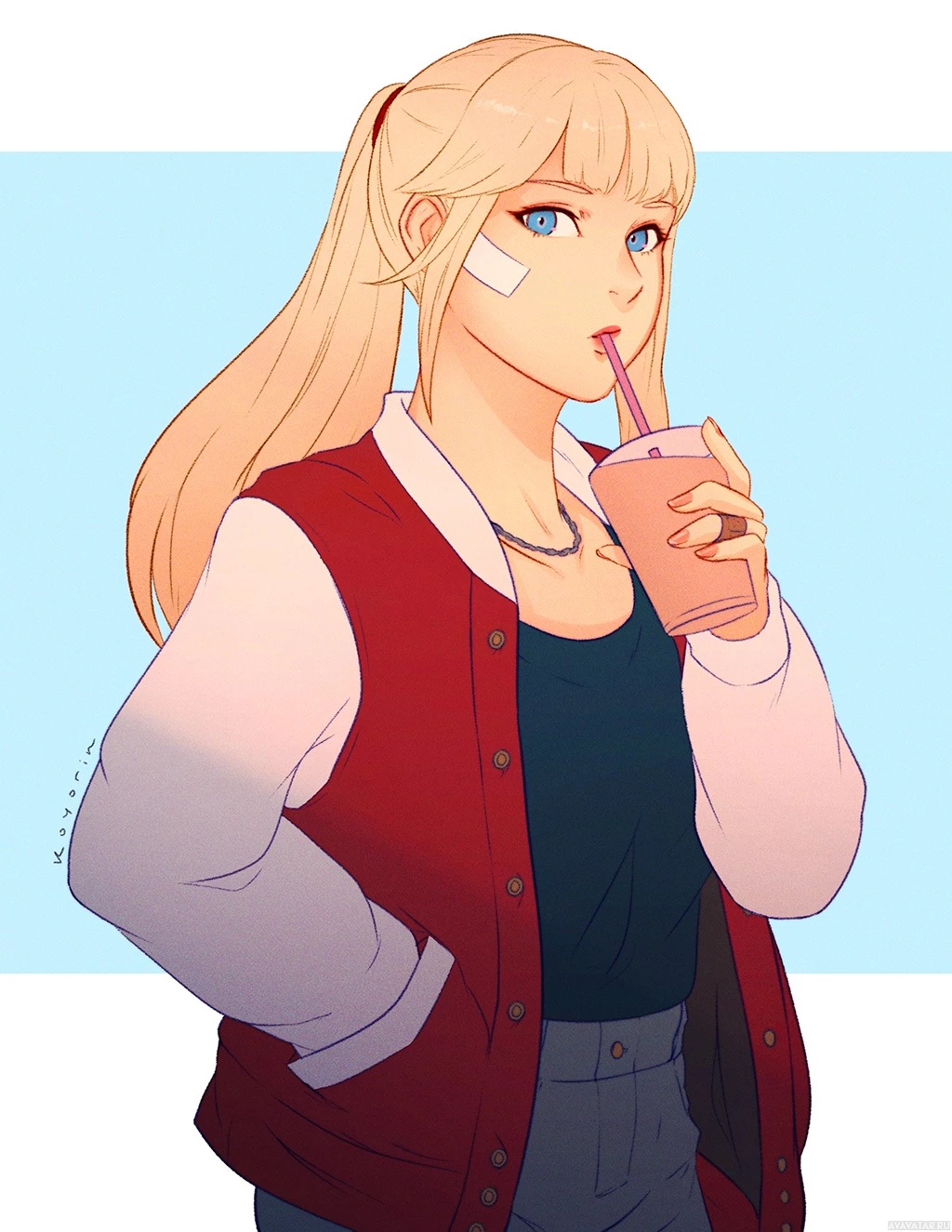 glass cup to her mouth as if she's drinking from it. There's also a visible bandage on her right shoulder. The background is blue with horizontal stripes that might suggest a calm or