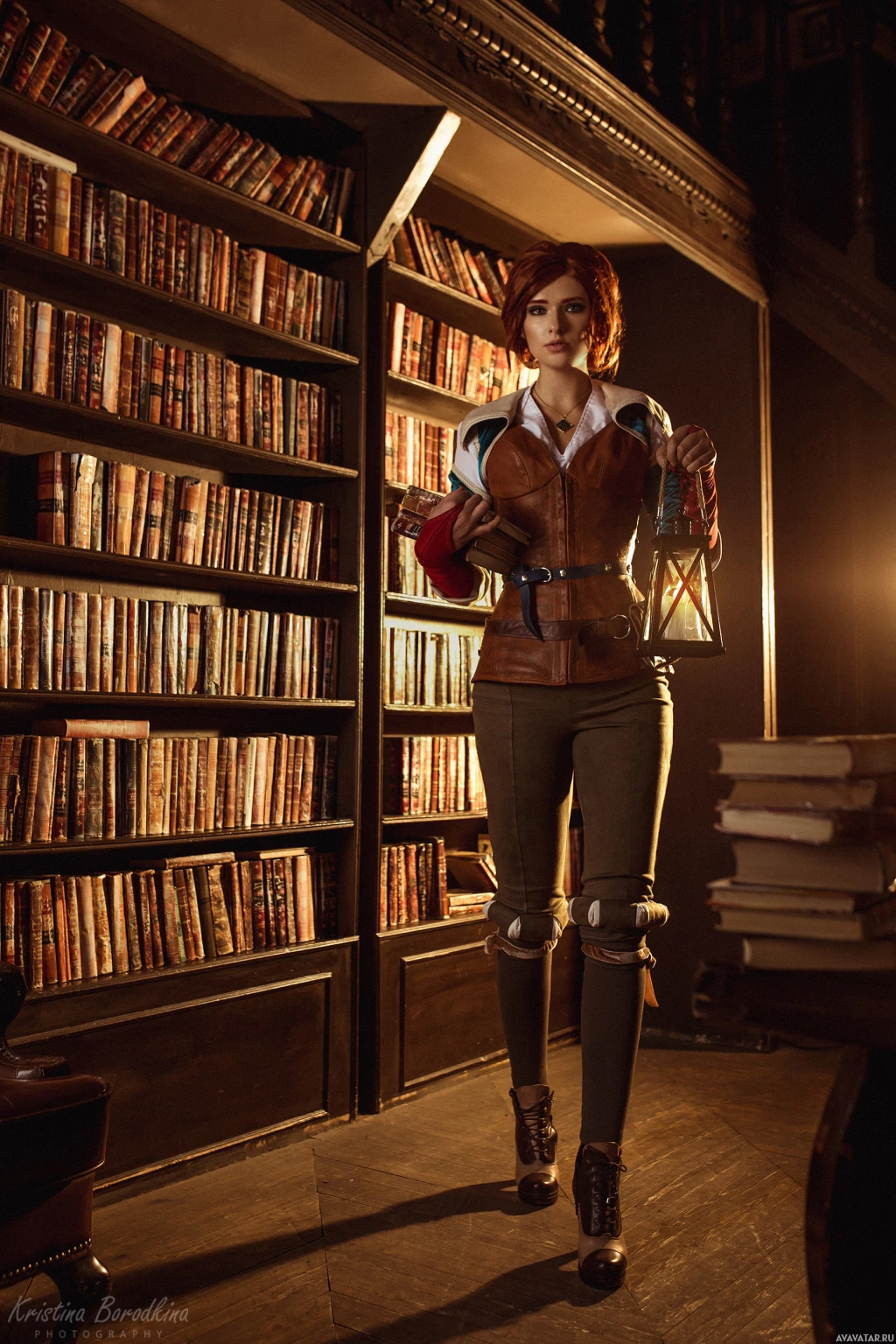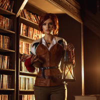 red hair. The setting appears to be an old-fashioned library or bookshelf room, which fits well with the character's scholarly background in the game. Triss is a witcher who has knowledge of various