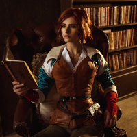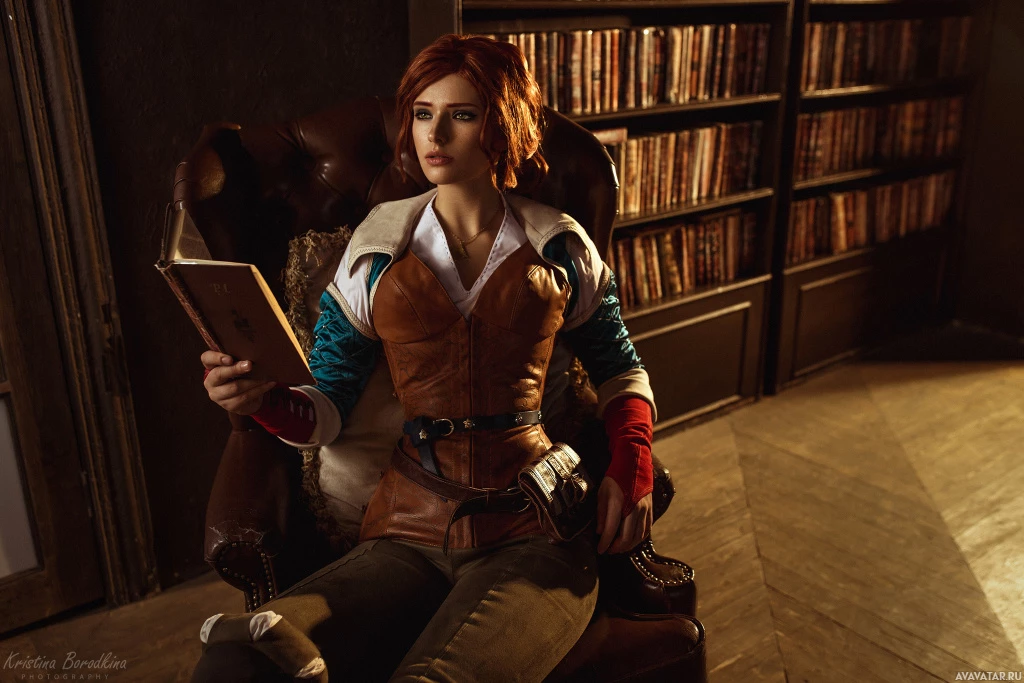 study setting, with wooden furnishings and bookshelves filled with books. The person is wearing a costume that includes a corset, leather boots, and has short hair styled similarly to Triss's