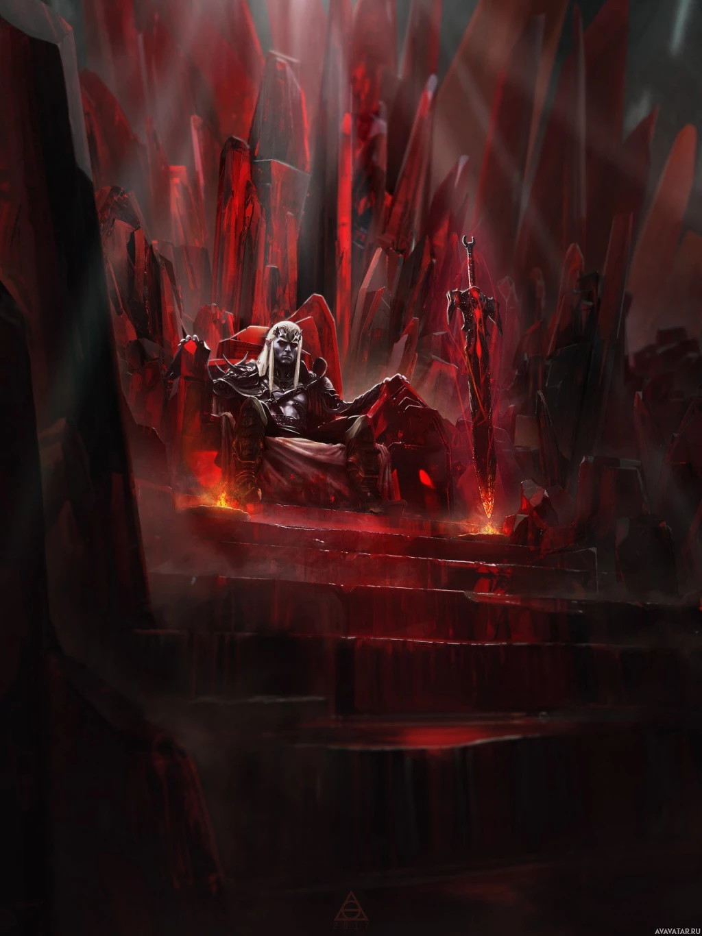 The image depicts a fantasy-themed scene with a character sitting on what appears to be a throne made of