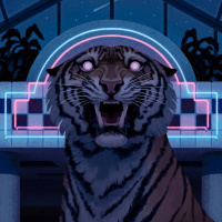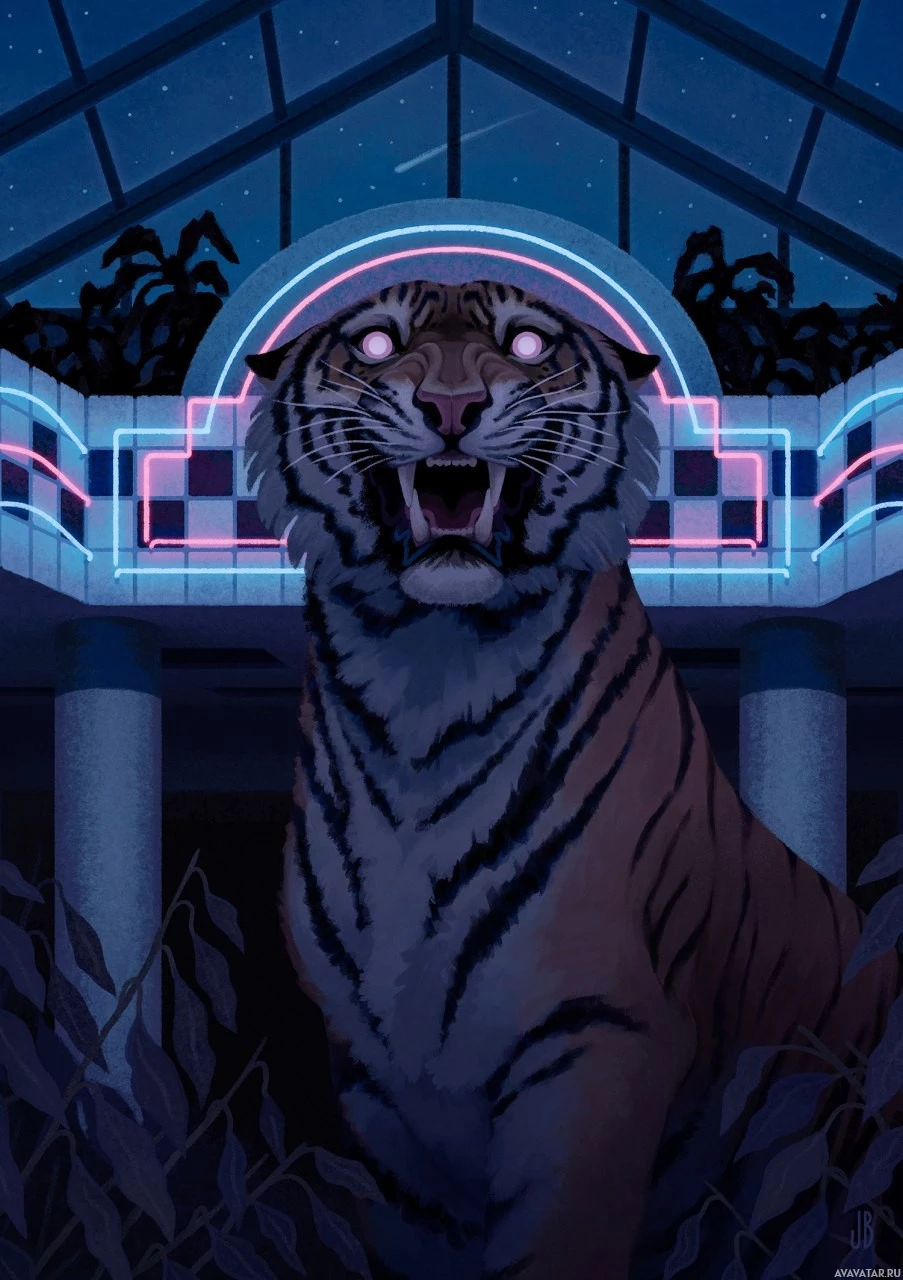 The image shows an illustration of a tiger. It's depicted in a stylized manner, likely for artistic or comic purposes. The tiger is shown with prominent features such as its eyes glowing and its mouth open in what appears to be a roar or a scream. The background includes what seems to be a structure with neon lights, suggesting a night scene or